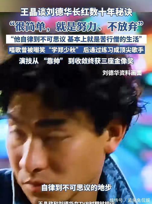 2025年8月,王晶在视频中谈到“华仔”红了一辈子的秘诀,称其 “努力、不放弃,他从不放弃,自律到不可思议的地步,过的生活基本上就是苦行僧的生活,真不是一般人能过的”。刘德华用行动证明:真正的“不老神话”,从来不是天赋,而是日复一日的选择与坚持。正如他自己所说:“运动永远不会辜负你。”这份对健康的敬畏与对生活的热爱,或许才是他比许多年轻人还精神抖擞的真正秘诀。